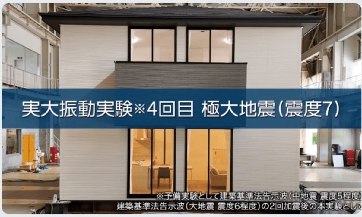 アイ工務店では各々が世界初となる、1.スキップフロア付きプラン、2.外張り断熱工法、3.シーリングレスサイディング住宅での実大振動実験を行いました。最大震度7を観測した北陸能登半島沖地震をはじめ様々な地震波を加振することで、高い耐震性能が実証されました。