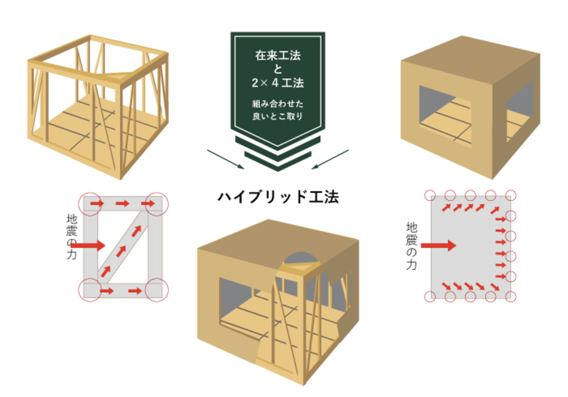 大震災でも倒壊しなかった実績を持つ「制震ダンパー」を全棟標準で搭載しています。「耐震」だけでは補えないものがある。だからこそ「制震」も必要です。日本の象徴的な建造物にに採用されている日本で最も信頼性の高いダンパーです。 また、「木造軸組工法」と「木造枠組壁(2×4)工去」の長所を組み合わせた「ハイブリッド工法」を採用しています。 「点」ではなく「面」で建物を支えられるので、地震による揺れにも、強い風にも耐えられます。