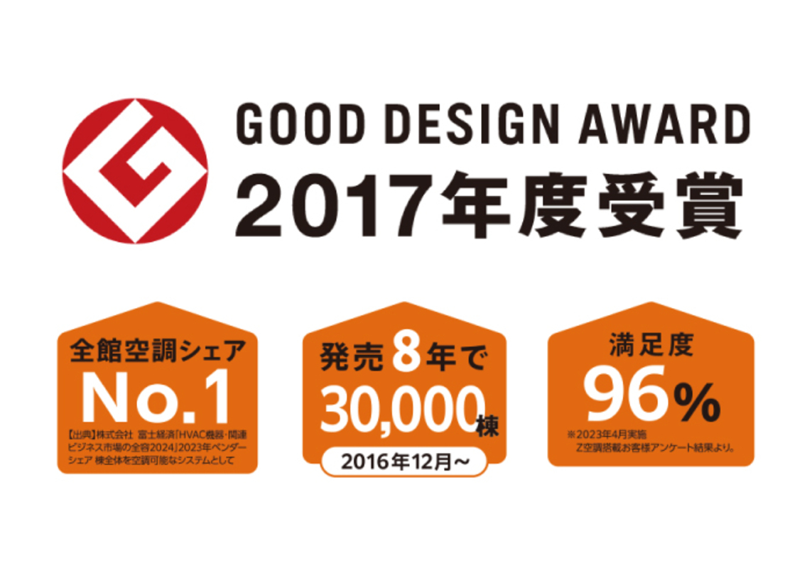 全館空調「Z空調」が「住宅メーカーが住宅設計の中で空調効率を設計段階から研究開発し、実験棟の中で試行錯誤を繰り返して導き出された低燃費の全館空調システム」として、2017年度グッドデザイン賞(主催:公益財団法人日本デザイン振興会)を受賞いたしました。