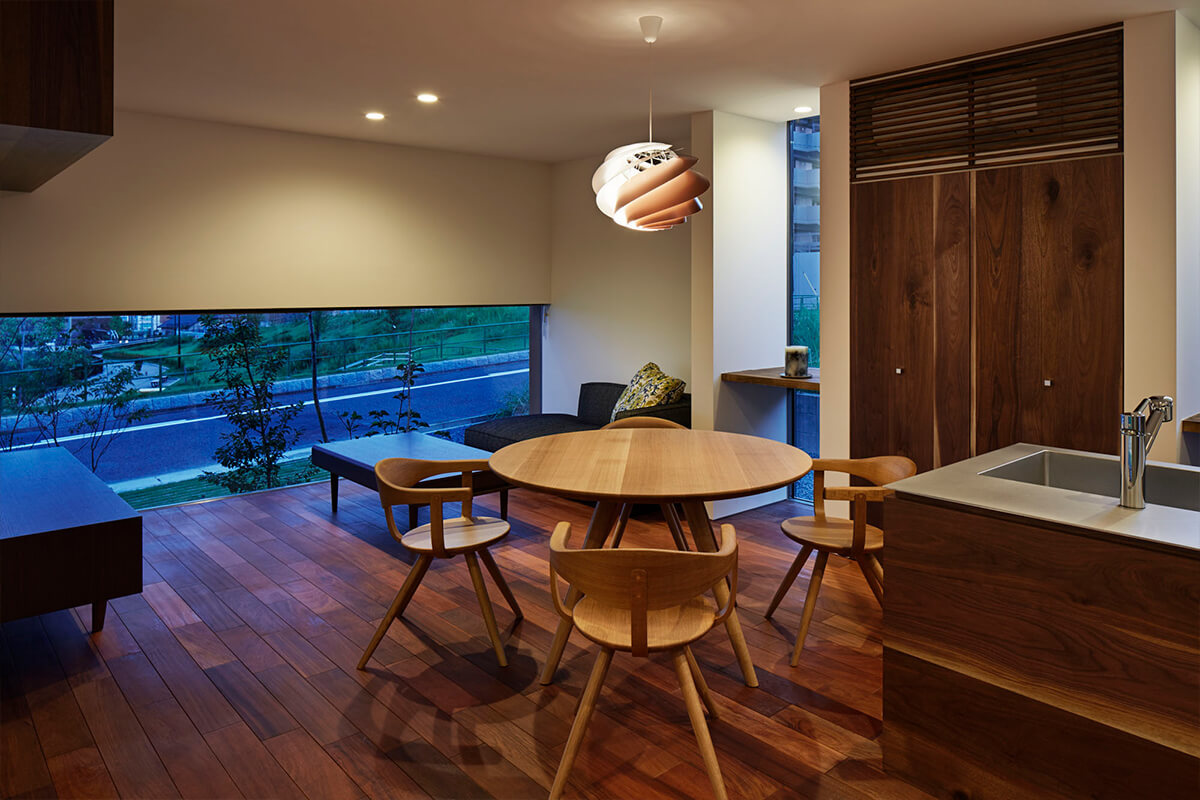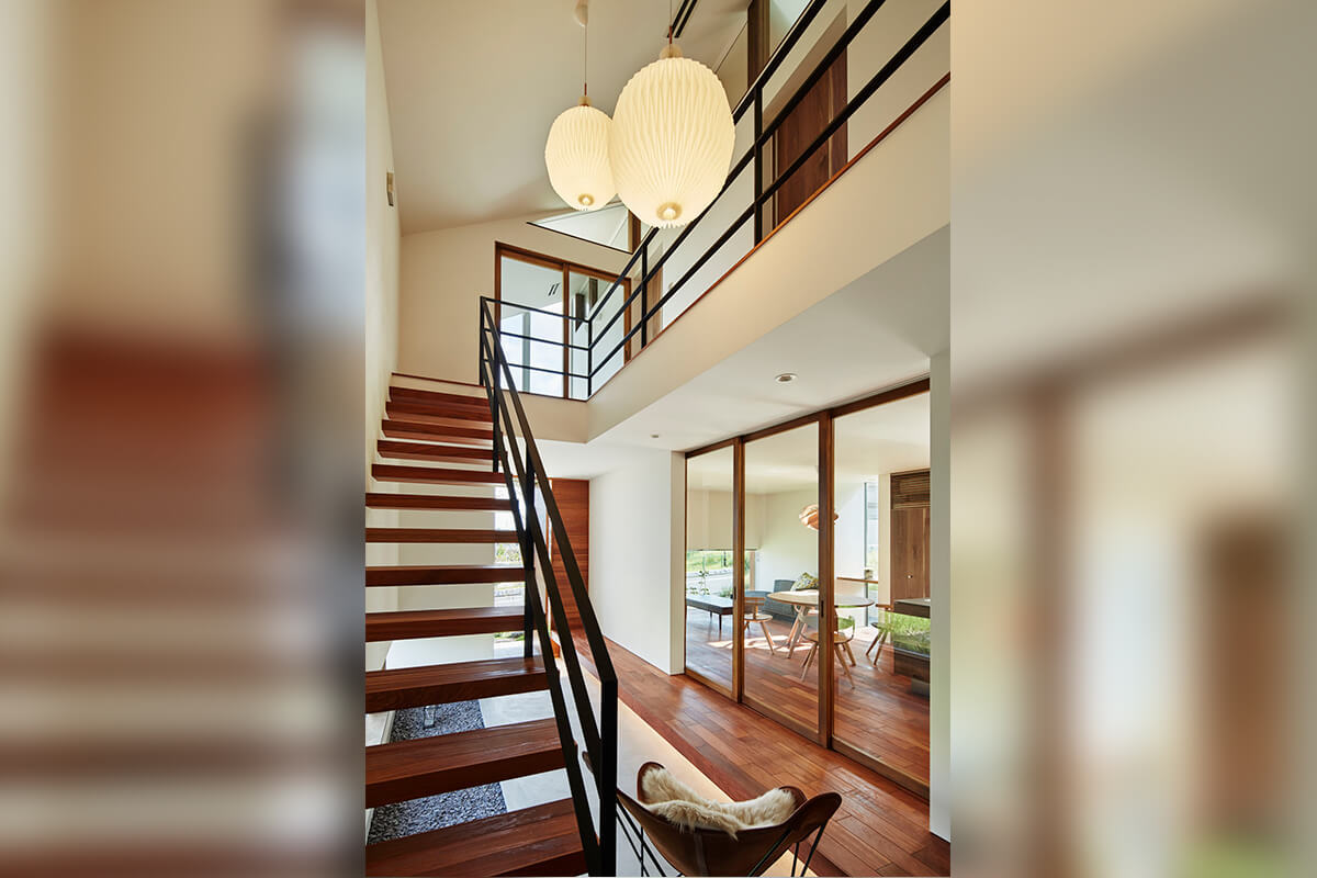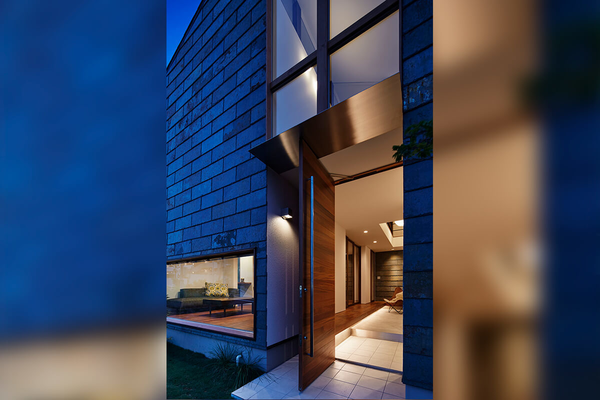外壁にはブラジル産の天然スレートを使い、力強さと安定感を表現。内装は床材にアフゼリア材を使用。収縮しないため、反りや割れ、ささくれが発生しにくく、手触りが良く、また素足歩行に適しているのが特徴。 [グッドデザイン賞 審査委員による評価コメント] 美しくエイジングする自然素材をふんだんに使った 住宅の計画である。天然スレートの屋根と外壁は建築に美しい表情を与え、街全体を魅力的にするだろう。 完成時をゴールとするのではなく、時間の経過とともに 美しくなる住宅や街の開発を目指す点が評価された。