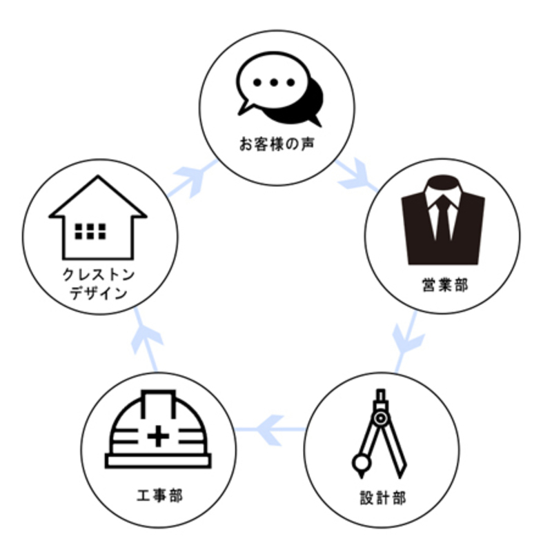 家選びで大切なことは、自らが納得し満足して家を購入できること。しかしクレストンホームが見つめているのはその先。満足のその先にある、ワンランク上の満足を目指しています。そのために同社が強みとしているのが営業部・設計部・工事部が三位一体となった、地域の特性に合った家づくり。毎週金曜日に欠かさず行う「部の横断会議」。営業部が地域やお客様の声を吸い上げ、それを設計部と工事部の観点からブラッシュアップし家づくりへフィードバックしています。