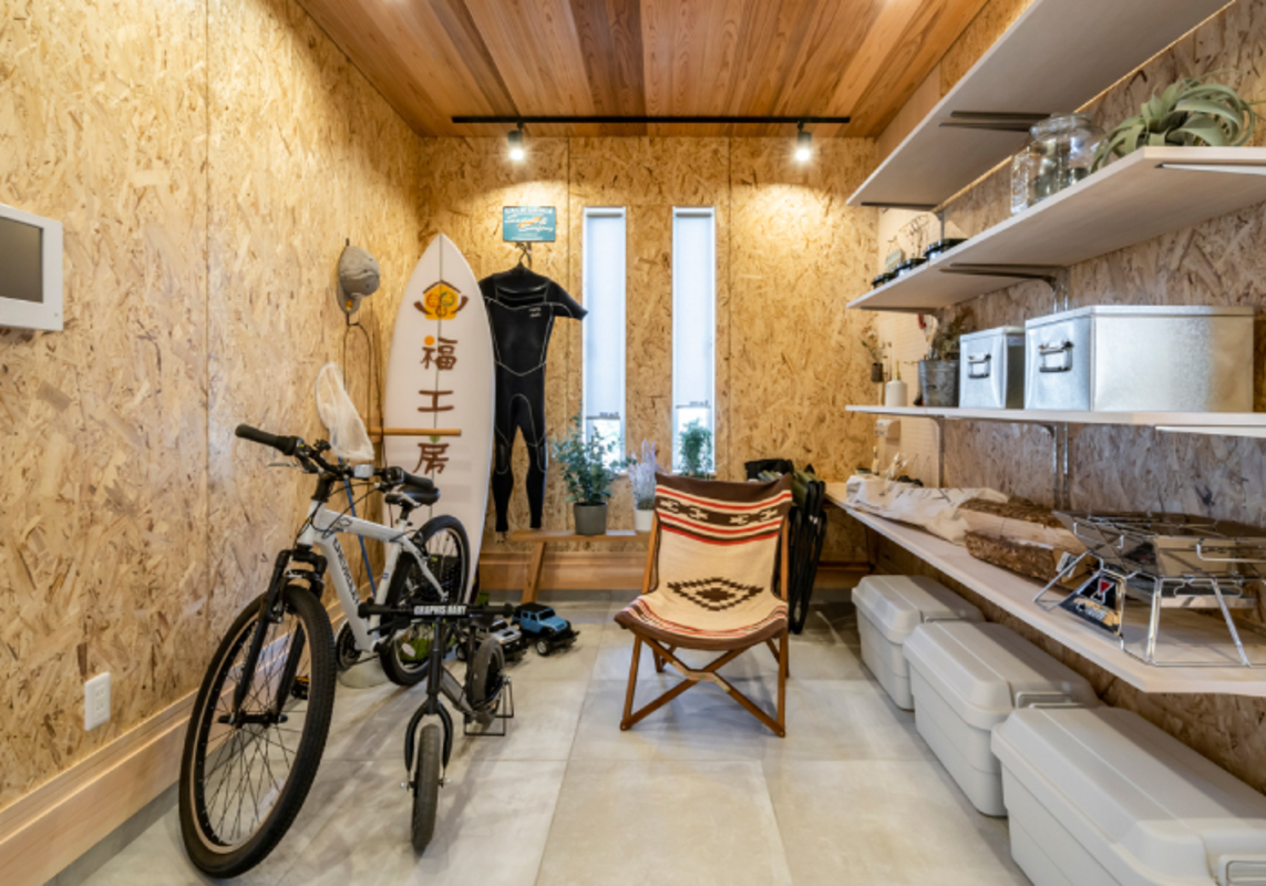お気に入りの自転車をディスプレイ、ボードや釣り竿のお手入れの場や、DIYを楽しむ工房など、天気に左右されず趣味を楽しむ空間として活躍します。