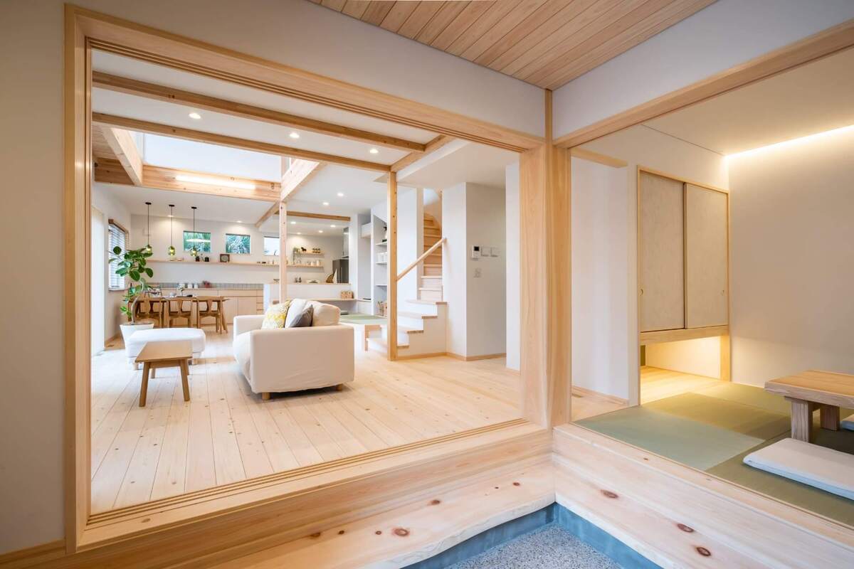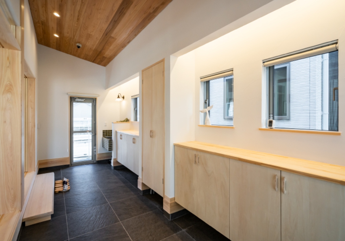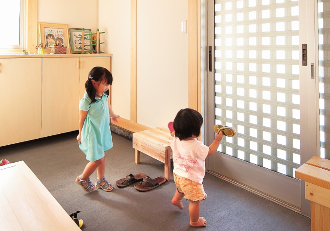昔ながらの懐かしさと現在の暮らしにも調和した新しさを感じる土間のある住まい。玄関ホール、廊下をなくすことによって、通り抜けだけのスペースから、接客、趣味、子どもたちの遊び場と多目的空間に変わります。お部屋に直接アクセスできる土間は、帰宅した家族とのコミュニケーションがとりやすいのも特徴。また、引き戸で仕切ることによって様々なシーンに対応します。