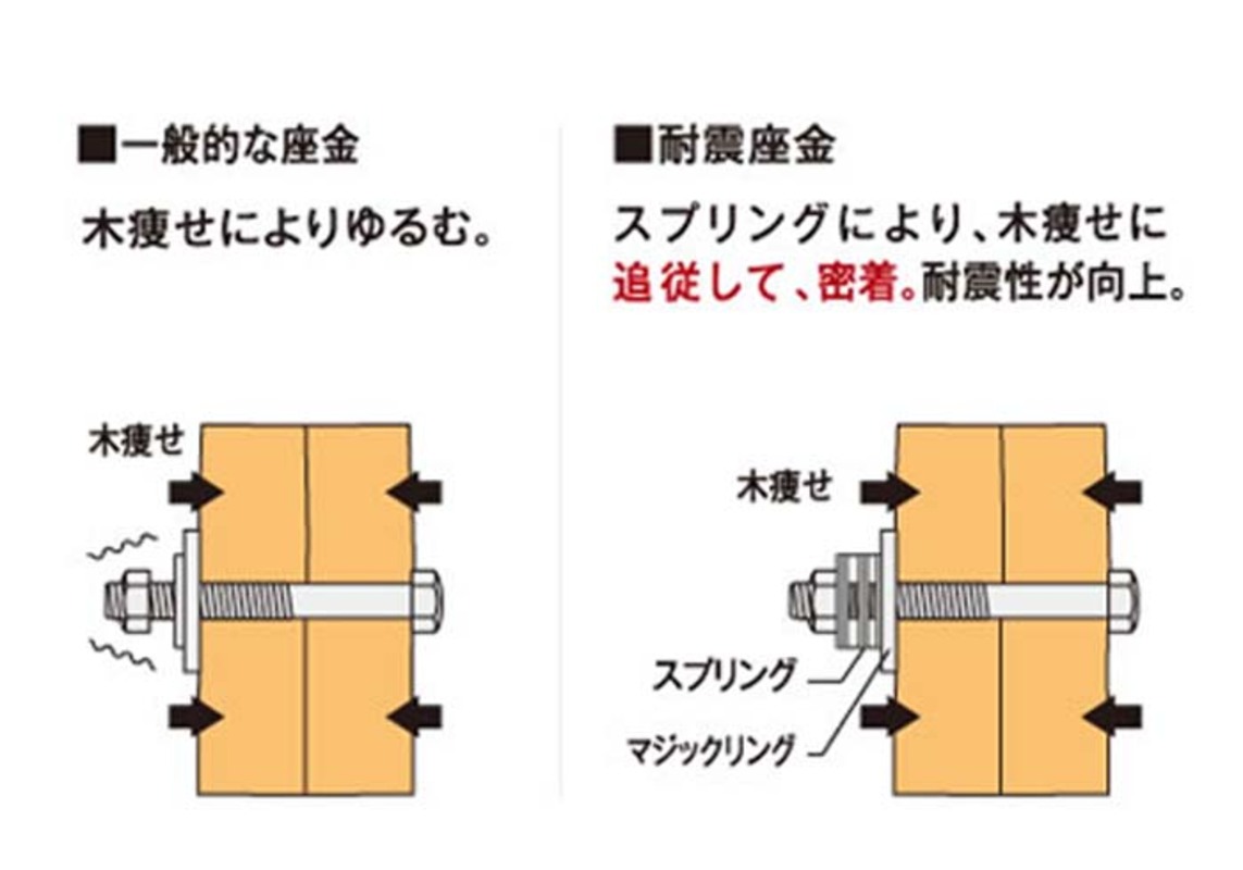 本当に地震に強い住まいを実現するため、金物ひとつにもこだわり抜きます。 我々が検討を重ねて選択したのが、現在の現場で使用している耐震金物です。 木材の木痩せ、荷重による収縮や、振動による緩みを防止する特殊なものを使用しています。 金物の中にスプリングが内蔵されていて、木材の木痩せに追従して密着。 付属するマジックリングとともに耐震性を強力に維持します。