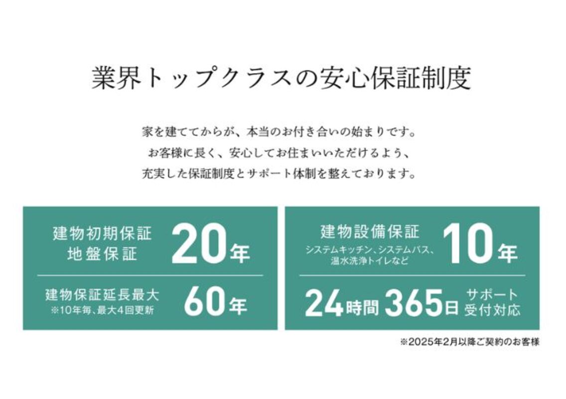 ご家族の安心を守る「建物初期20年保証」をお約束。お子様の教育資金等がかかる時期も、住宅メンテナンスの心配なく、安心してお過ごしいただけます。建物保証最大60年まで延長可能。さらに、住宅設備機器も10年間プラスで保証。出張費、部品代、作業料も一切不要。手厚い保証で、家族の未来をサポートします。