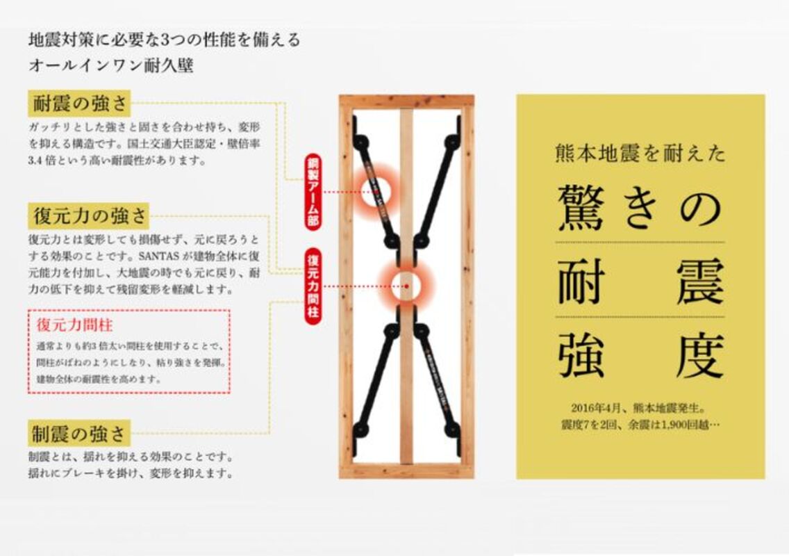 同社の家づくりでは、耐震性能が最高等級(耐震等級3)を標準採用。地震に強い構造(耐力壁SANTAS)+ 万が一の地震に備える保証で長く安心して暮らせる住まいを実現。また、地震補償保険も用意しており、災害に強い家を建てるだけではなく、建てた後もサポートしてもらえる体制が整っている。