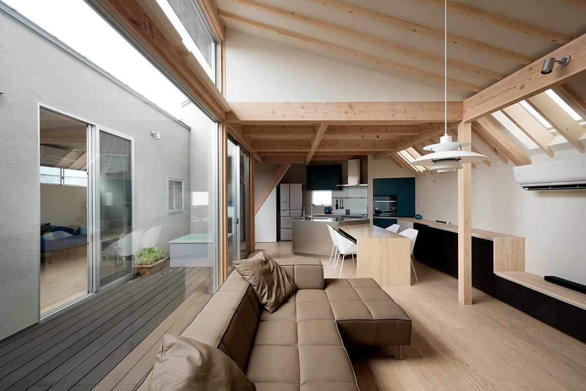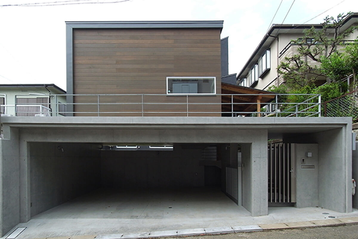 等級3の耐震性能に制震工法を付加した高断熱仕様の完全分離型2世帯住宅です。東側道路を挟んで対峙する建売郡からの視線を回避することと、高さのある燐戸とのプライバシーが要求されました。良好な景観が周囲に望めないためにコートハウス形式により採光や通風を充分に得られるように配慮しました。道路側外観は町並みに配慮して高さを抑えたボリュームとし、傾斜壁により印象的な街並を形成しています。 回遊性のある動線や用途ごとの床レベルの変化が空間に多様な展開を与え、天井高の操作によるメリハリと自然素材とがバランスをもつことで気持ちのよい生活空間と住みやすい生活動線を提供しています。