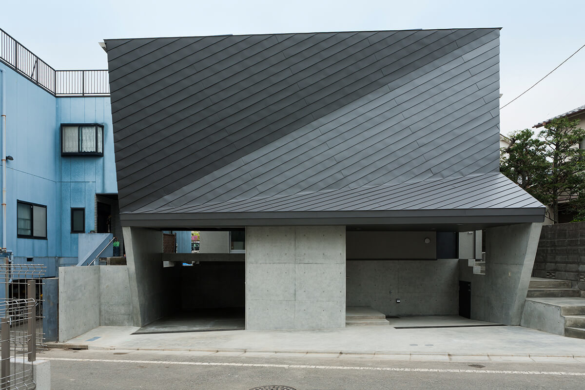17.6坪の敷地に計画した都市型住宅です。 周囲は高層マンションやビルに囲われた敷地ですが、内部の立体的な構成によって充分な明るさが得られると共に、空間に広がりや奥行きを与えています。 四角い建物が建ち並ぶ環境に対して、建物外観はルーバーのピッチを調整することで、柔らかい表情を与えました。 内部はコンクリート打ち放しの空間ですが、外断熱仕様によって改正省エネ基準値:断熱等性能等級4以上の高断熱環境を満たしています。