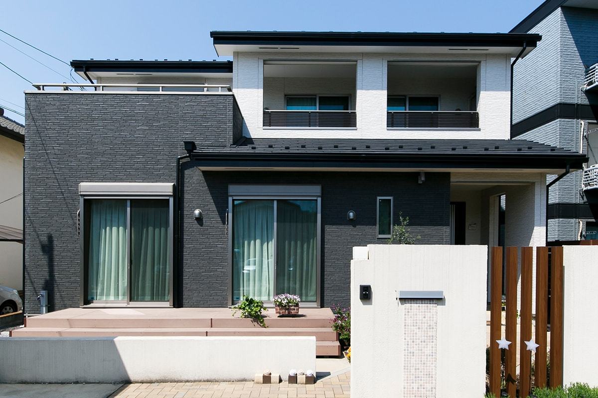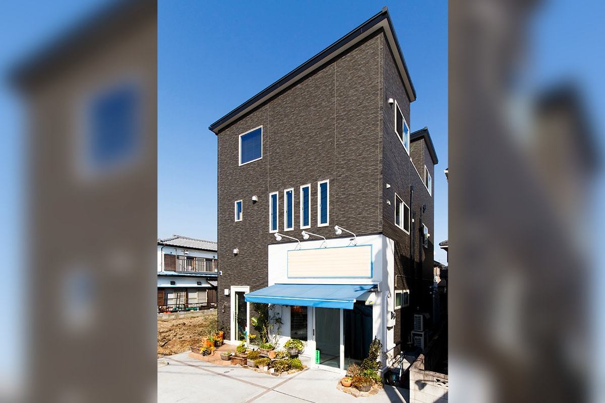 濃いブラウンカラーとホワイト系の塗り壁を採用したスタイリッシュな外観デザインに。店舗部分は白とブルーを組み合わせ、清潔感漂う装いを演出。生活感の出やすいバルコニーは位置や向きに気を遣い、雨どいも黒を採用するなどスッキリ見える外観を追求している。