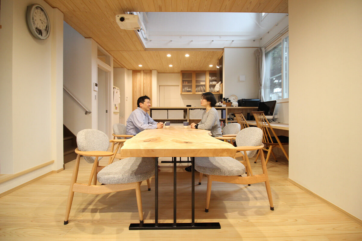 私たちはお客さまと一緒に家を建てることを大切にする「木のプロ」です。ヒアリングから、設計・施工・アフターメンテナンスまですべての工程をお客さまと一緒に並走します。最初にお問い合わせいただいた瞬間から、「なぜ天然無垢材で健康を大切にした家がよいのか」を知っていただくため、無垢材のことや建築のすみずみまでご説明。自分の家に使われる木の種類や家の構造、大工の手仕事を知れば知るほど、家づくりはもっと楽しくなりますよ。