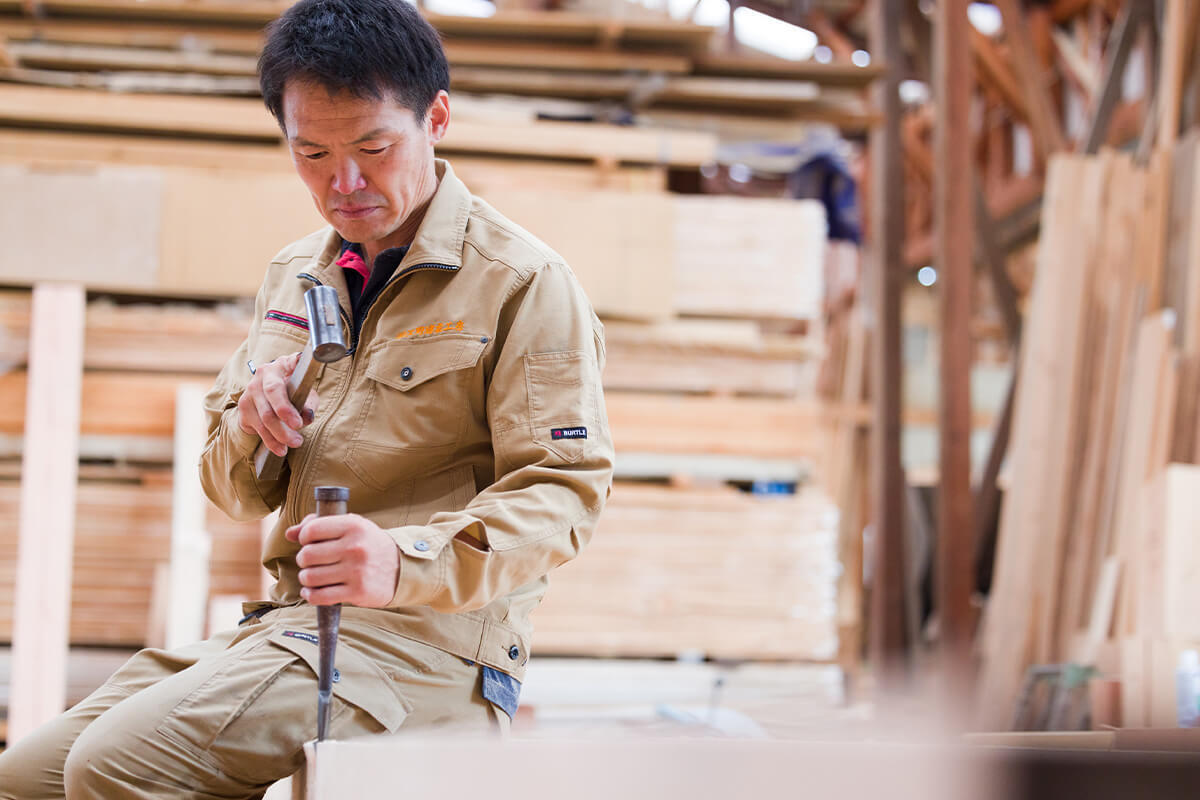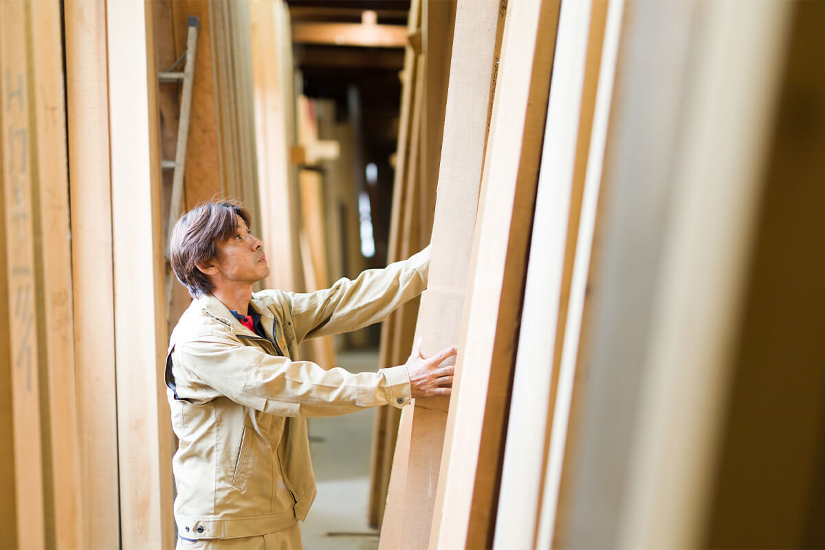 製材した木は風通しの良い工房で基本3年以上、樹種によってはじっくり何十年も天然乾燥させ、気候風土に馴染ませてから使用します。天然乾燥させた木は、高温で素早く処理する人工乾燥と異なり、防虫成分を含んだ油分の揮発が抑えられ、シロアリ対策に有効です。またストレスを与えられていない分、粘りや香り、色艶など木そのものの魅力が残ります。手間と時間のかかる天然乾燥ですが、人工的に作り出された無垢材と比べると、その強度や耐久性、美しさが段違いに優れています。つまり自然本来の力を生かした、より「本物」の度合いが高い家をつくれるのです。