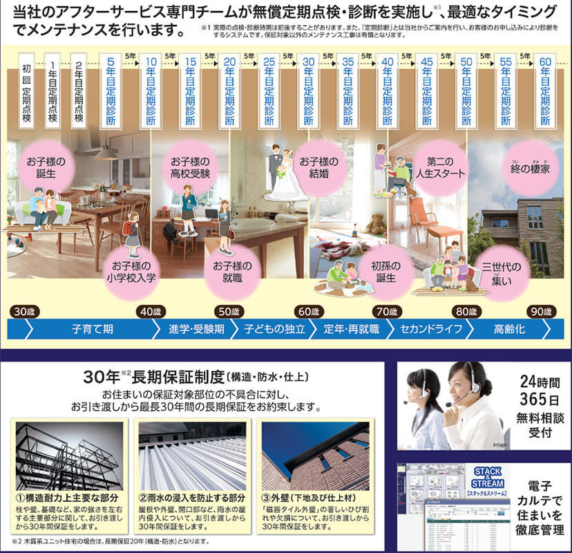 「60年サポートシステム」お引渡しから2年目までの計3回の定期点検と、5年目から各5年ごとの定期診断を無償で60年間実施(保証対象以外のメンテナンス工事は有償)。高品質・高耐久を誇る同社では、初期保証制度も長期間対応。「構造耐力上主要な部分」「雨水の浸入を防止する部分」については引渡しより30年の保証を無償で実施している(メンテナンス費用は有償)。※商品により保証期間の違いがございます。詳しくは営業まで。 さらに、住まいのことを24時間365日お電話やメールでご相談いただける体制も整えております。