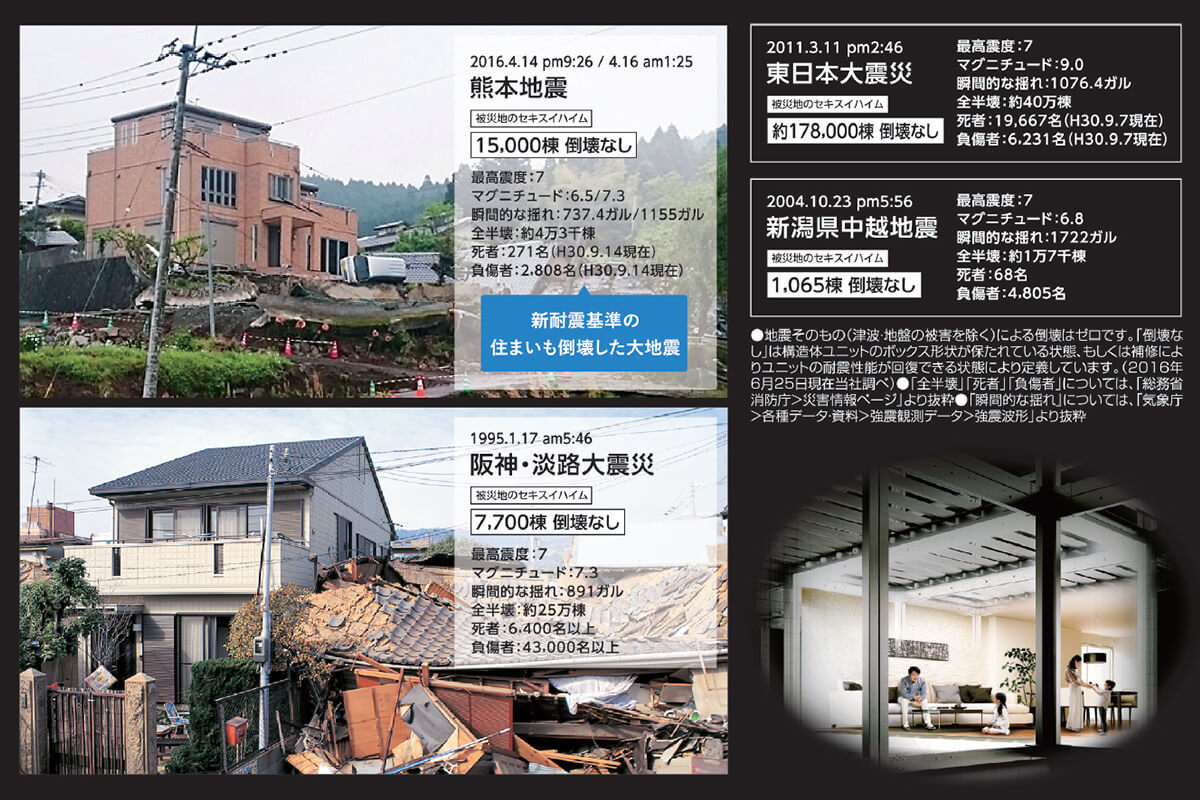 セキスイハイムの家は本当に地震に強い。数々の巨大地震でその強さは実証されています。耐震性能は、地震のその時に発揮されてこそ意味があります。被災地で建ち続けているハイムが、その真の強さを物語っています。