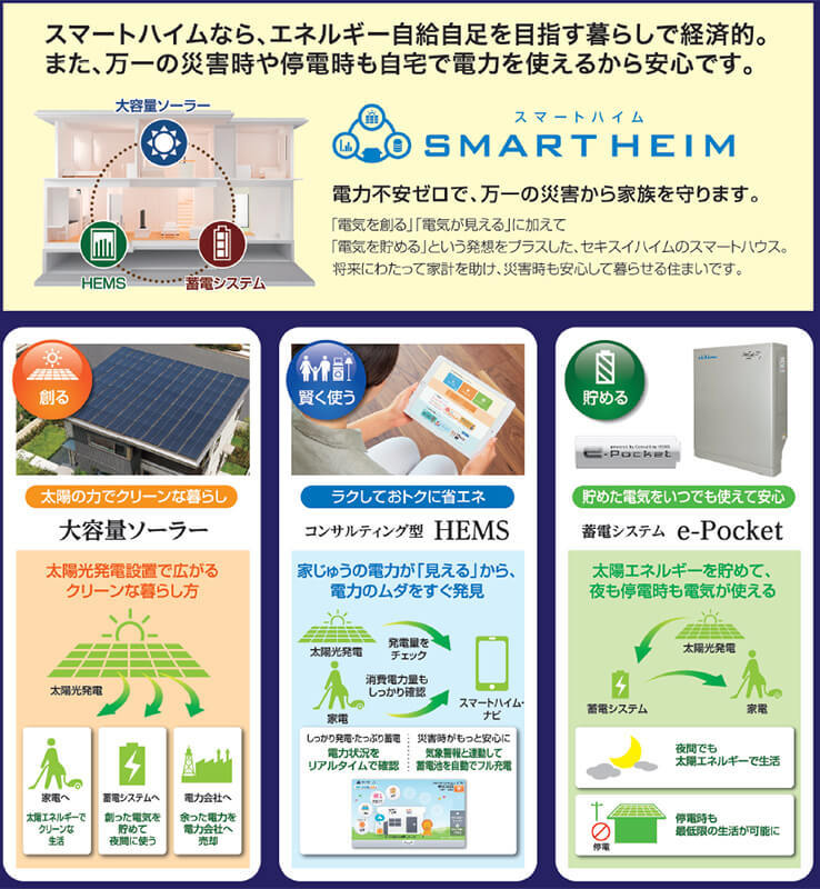 セキスイハイムでは、大容量ソーラーに加え家庭用蓄電池を搭載し、HEMSの「スマートハイム・ナビ」で電力の使い方を賢くサポート。エネルギーの自給自足を目指すことができます。すでに多くのご家族がムリな節約をすることなく、経済的で環境にもやさしい「リアルゼロエネルギー」の暮らしを始めています。