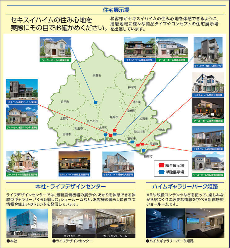 播磨地域の各エリアに13展示場を出展。ハイムギャラリーパーク姫路で家づくりの情報を学べます。
