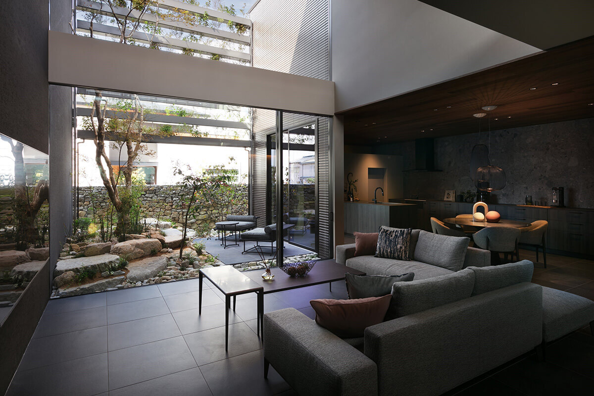 外部から内部をグリーンウォールと植栽で柔らかく目隠しするセミクローズ外観から開放的な内部空間へ。 大きな吹抜と大開口から自然を取り込みプライバシーを守りながらダイナミックに外部空間と繋がります。 窓やカーテンを開け放ち、光や風、緑を感じられる住まい。