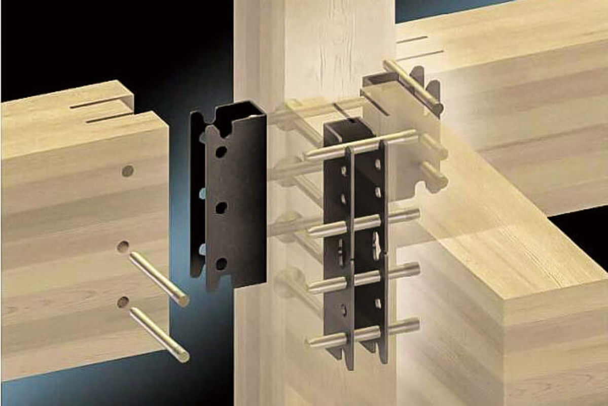 七呂建設では、一般的な木造軸組み工法の仕口(しくち)※と接合金物を使いません。仕口の欠損を少なくし、仕口・継手部分を梁受け金物やホゾパイプなどの特殊な金物で接合する金物工法を採用しています。この工法は在来工法よりも耐震性に優れ、梁の強度も確保さまます。接合部分の引張強度は従来の約2.8倍です。 さらに、安定した品質のエンジニアリングウッド(集成材)を使用することで柱・梁の施工精度にばらつきを生じることなく、接合することができます。 ※構造部材である柱や梁、桁など2つ以上の部材を組み合わせ、接合する方法。または、その接合箇所のこと。
