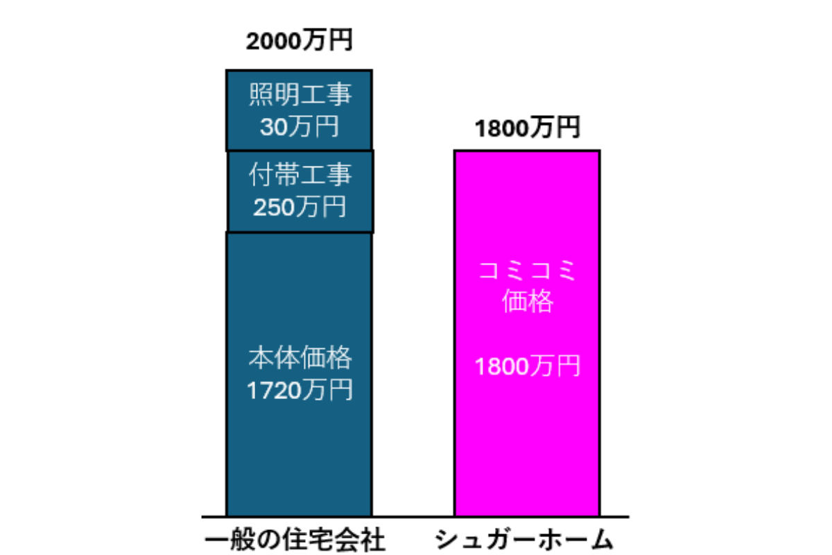 「聞いてた金額と違う…」こんなことがご契約寸前で起こってしまうと、 時間をかけたのにもう一度検討し直しになることも。 シュガーホームは分かりやすい完成引渡価格表示です。 電気工事や足場工事、屋外給排水工事…等 生活するために必要な工事もコミコミです! ※画像は参考例となります。