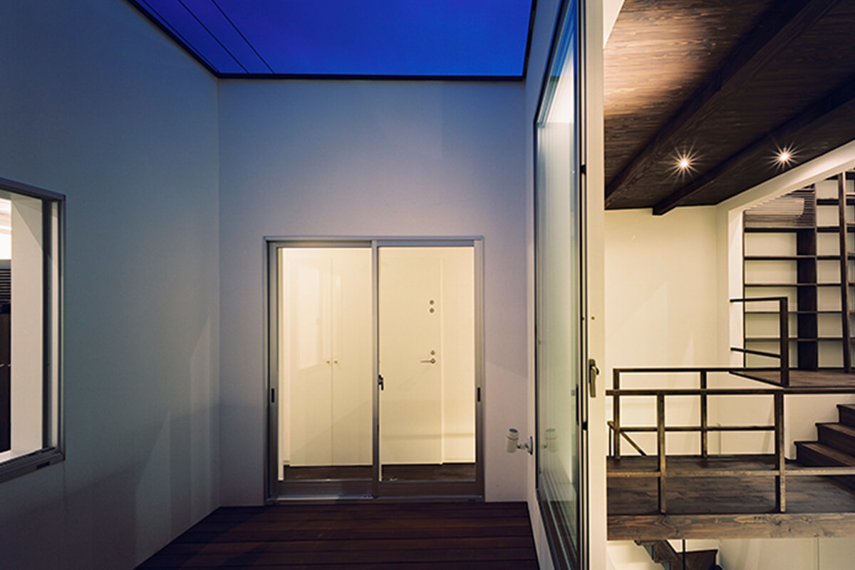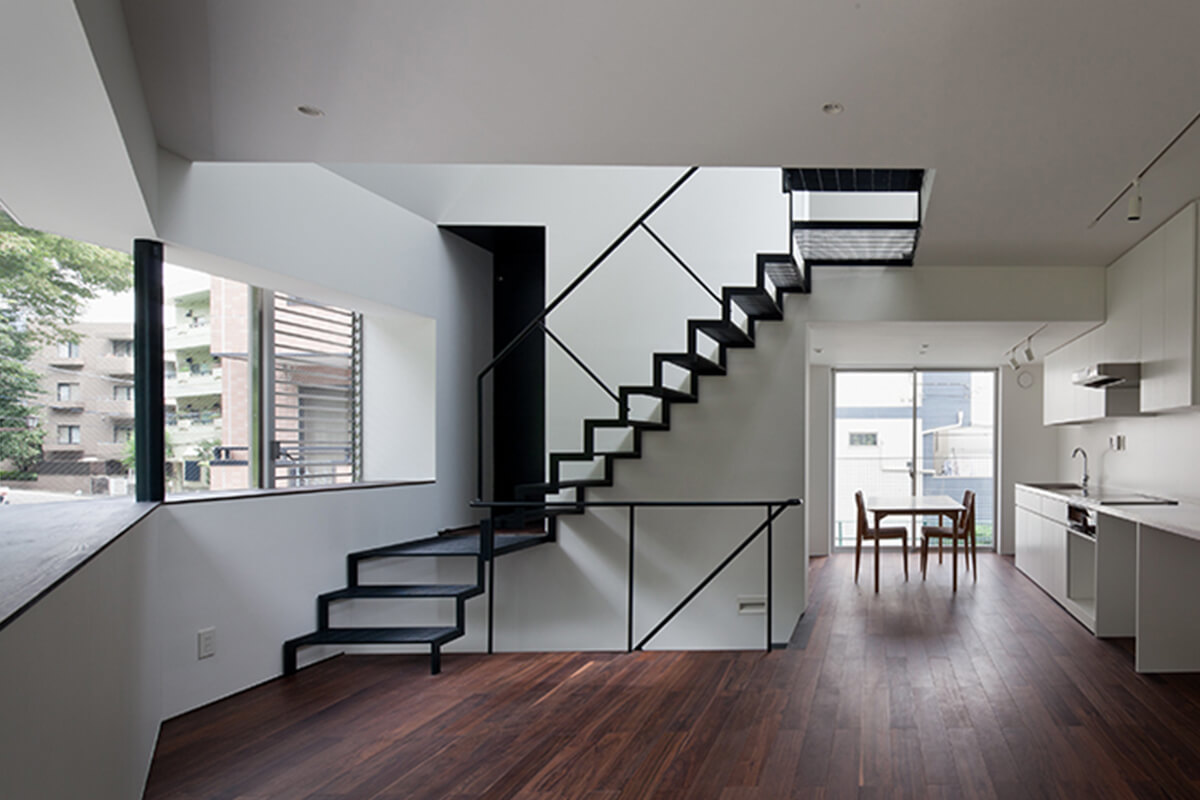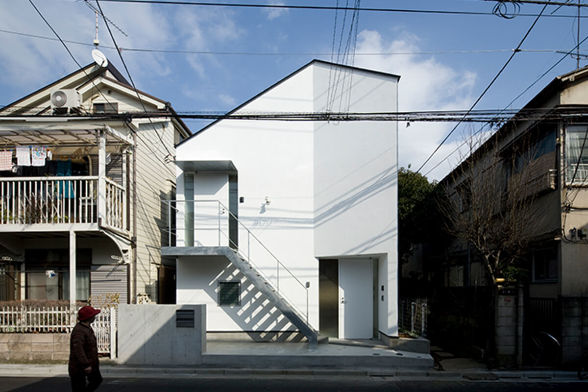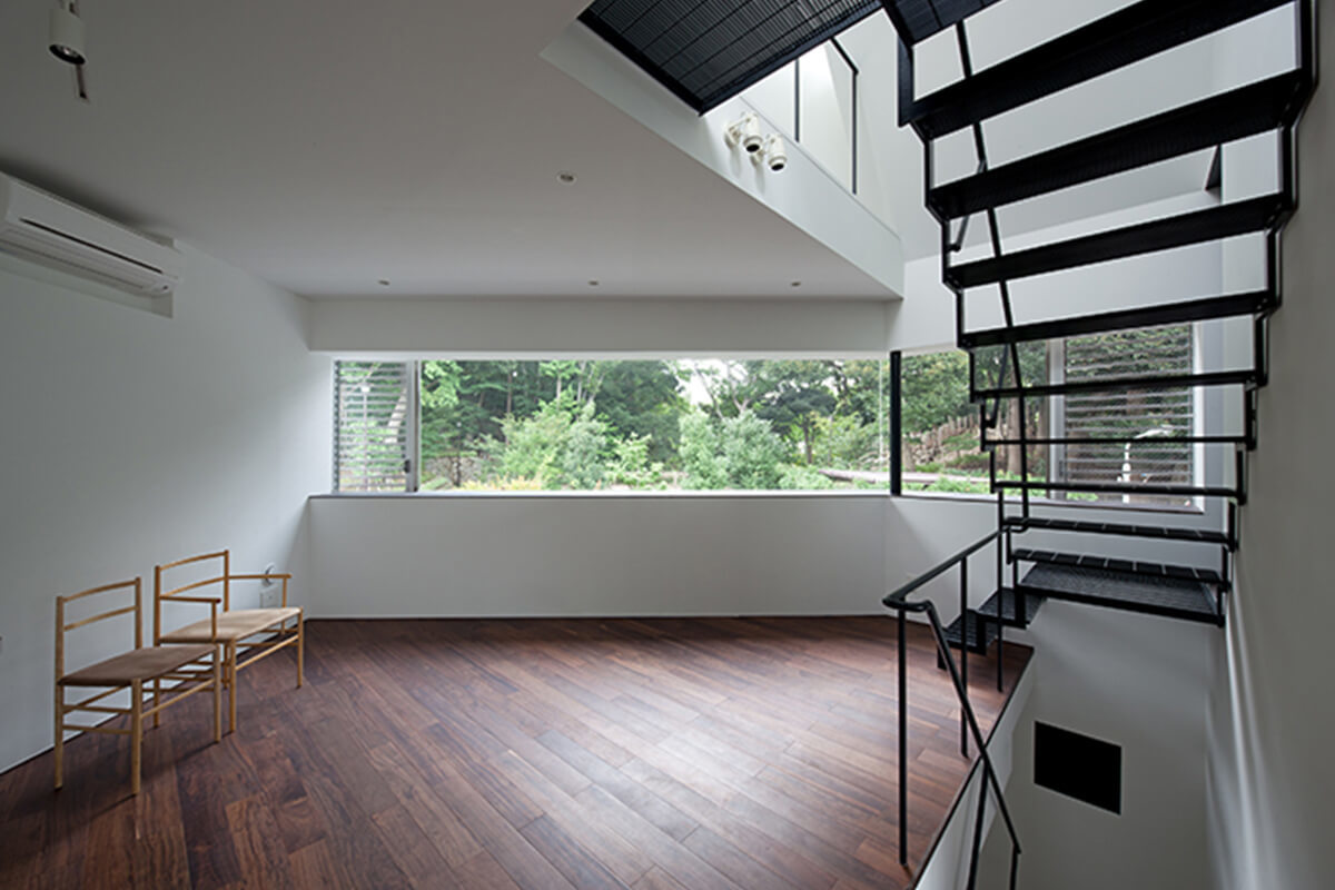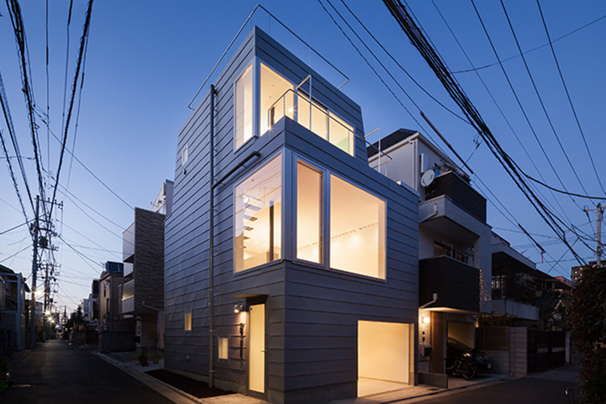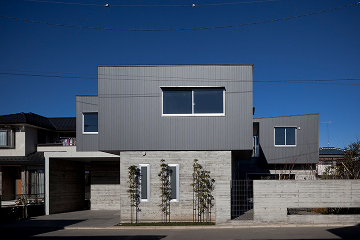 また変形地、細長い敷地等の敷地条件が厳しい場合も、規格住宅のハウスメーカーでの家づくりは難しいことが多いです。このような敷地でも、間取りに制約がない設計事務所での家づくりが向いています。写真は間口の狭い敷地に建つ住宅です。