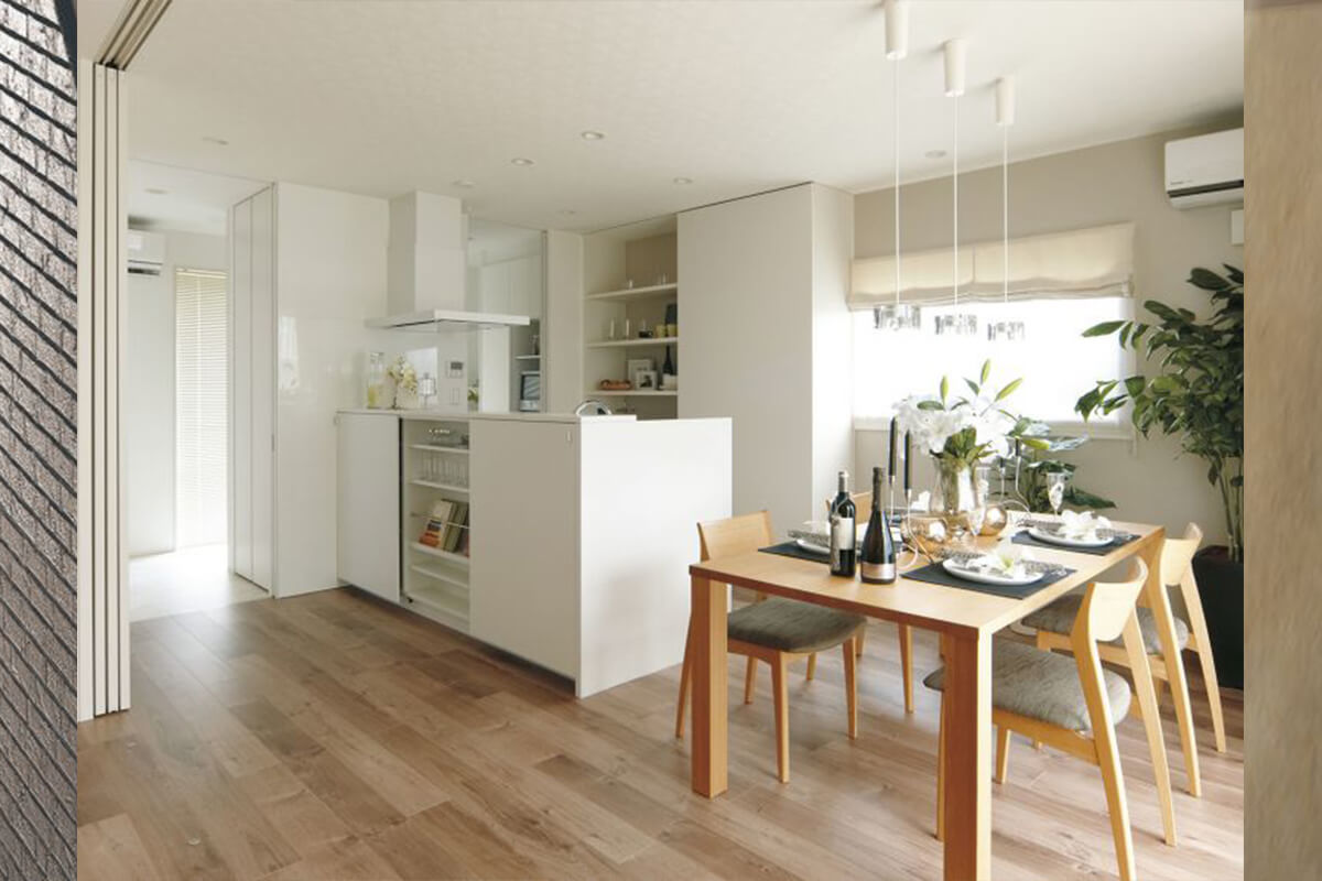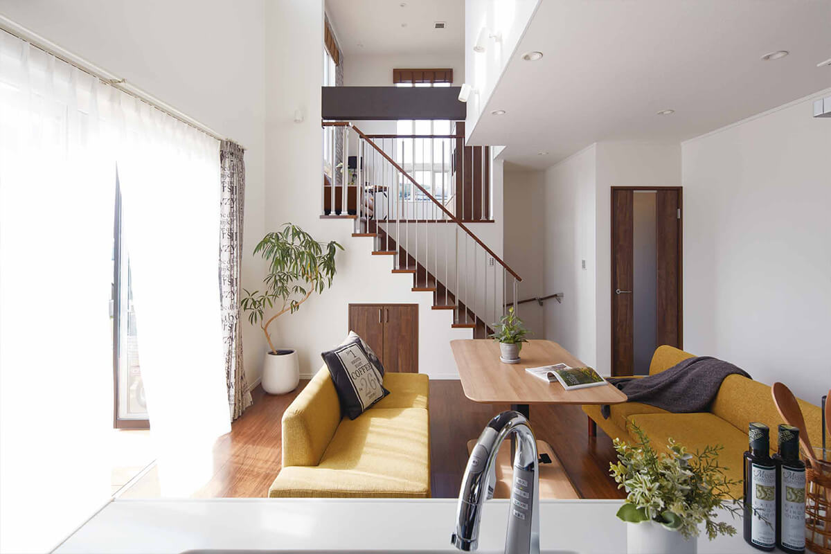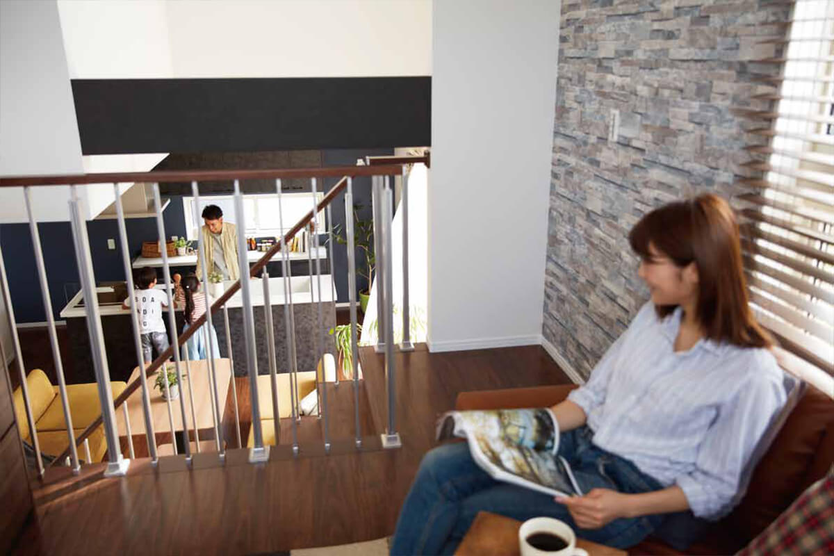 壁でなく床の高さの違いで空間を仕切るのがスキップフロア特徴。キッチンでお料理をしながらでもダイニングの様子やリビングで遊ぶ子供の様子を見ることができ「家族がいつもひとつの空間の中にいる」そんなつながりを感じられます。田山建設の家づくりについて