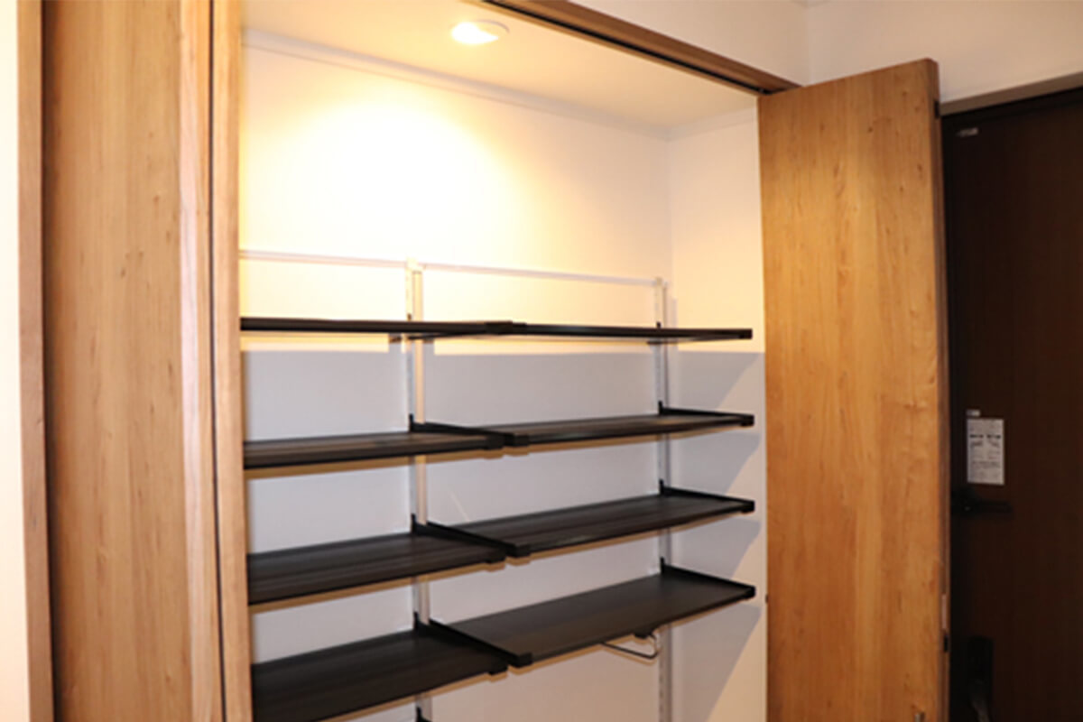 大容量の シューズクローゼットは照明がついて使いやすさ抜群!靴のほかにレインコートをかけたりベビーカーの収納もできて便利