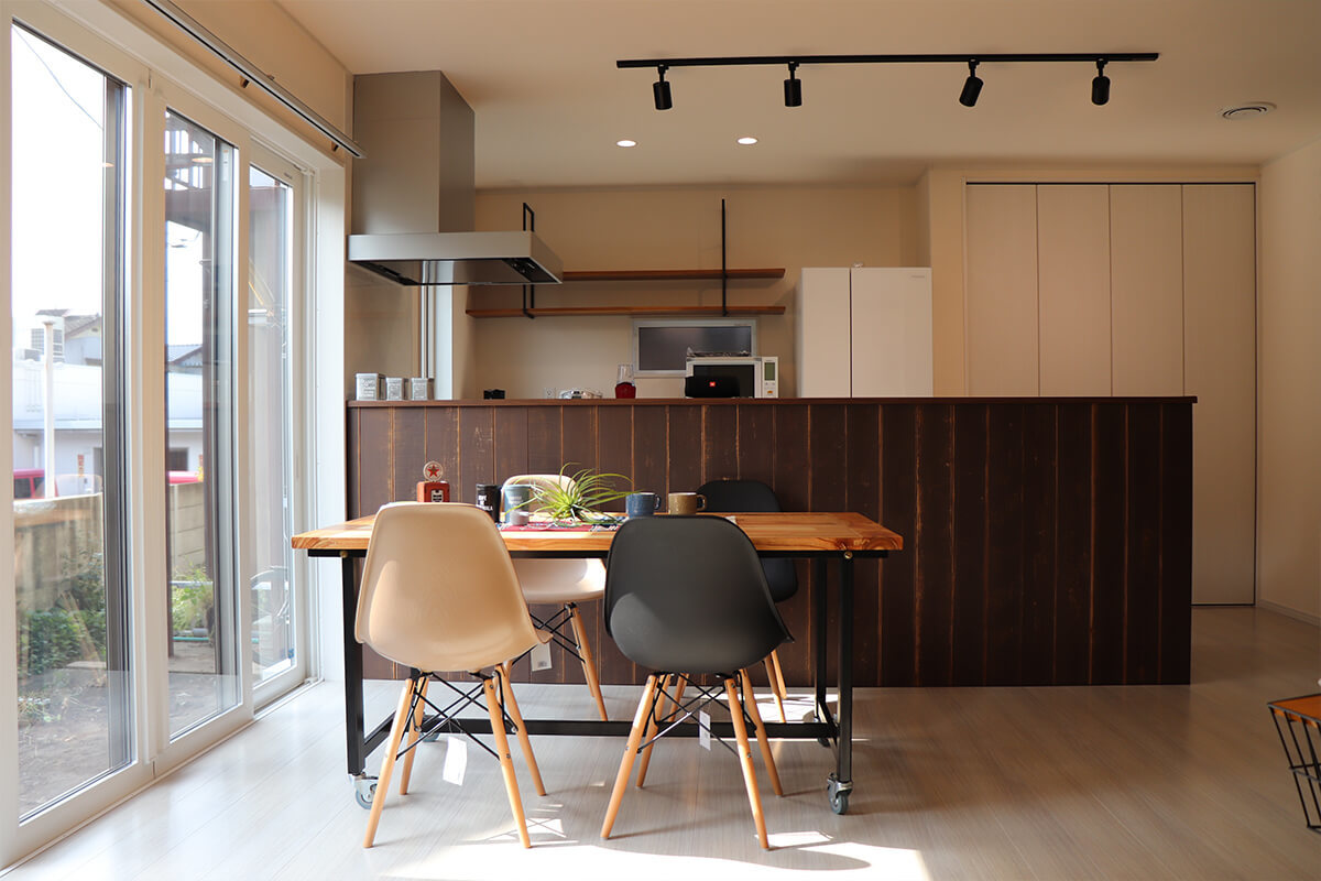 バーチカルブラインドがかっこよく引き立ててくれるダイニング。家族の様子を見ながらご飯を作れます。ダクトレール照明と腰壁がおしゃれな空間で休日はママ友とのお茶タイムを楽しんでいただけます!