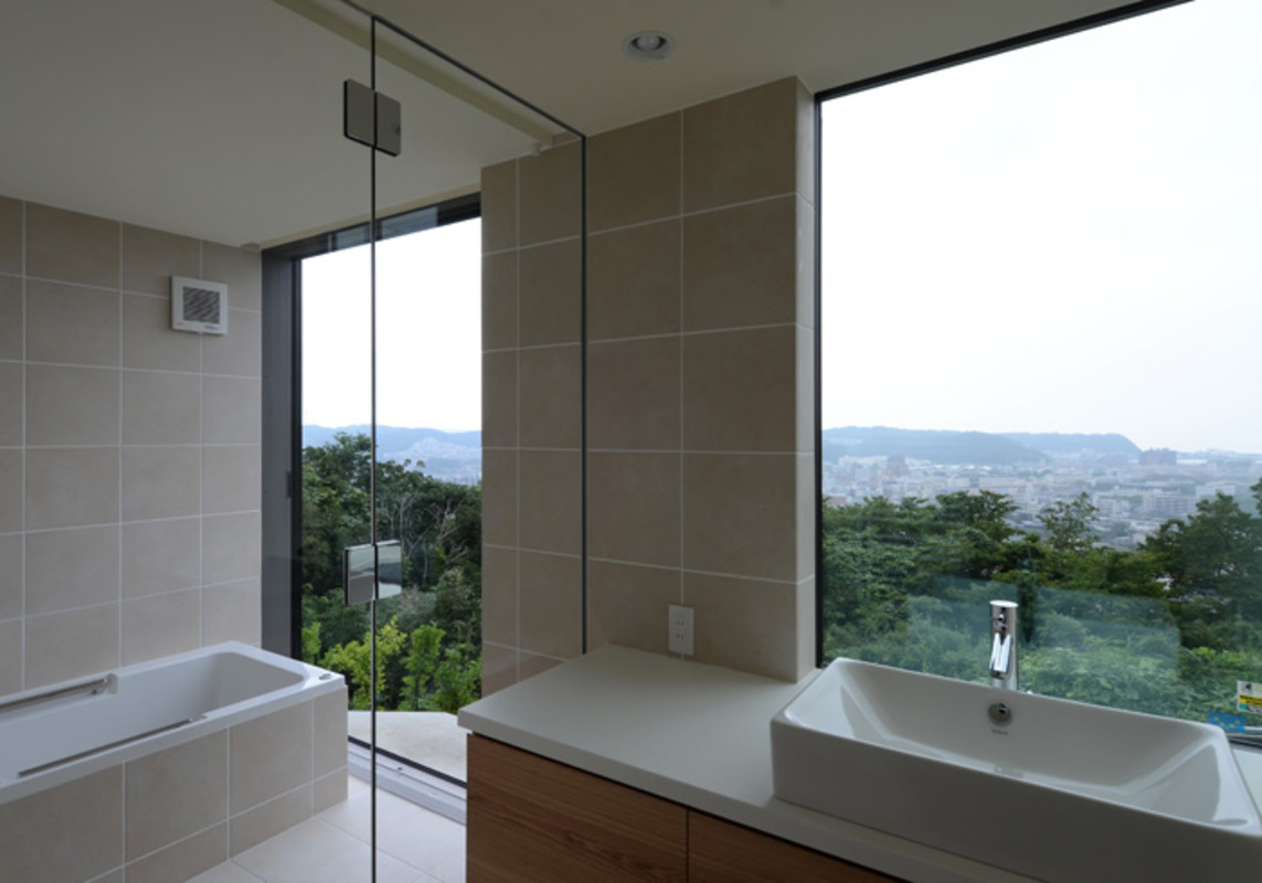 斜面地の上であるメリットを生かし、誰にも覗かれない開放的な水廻りが実現しました。窓は既製のアルミ樹脂複合サッシュを使いながら、浴室は片引、洗面はFIX窓として、まわりのフレームが見えないスッキリとしたデザインとしています。洗面と浴室の間は強化ガラスドアとして、まるでホテルのようなスッキリとしたスタイリッシュなインテリアとなりました。