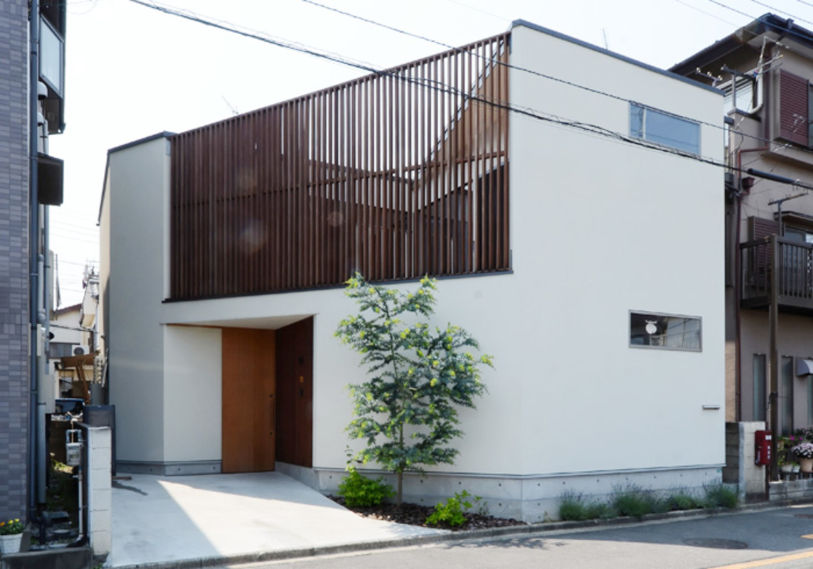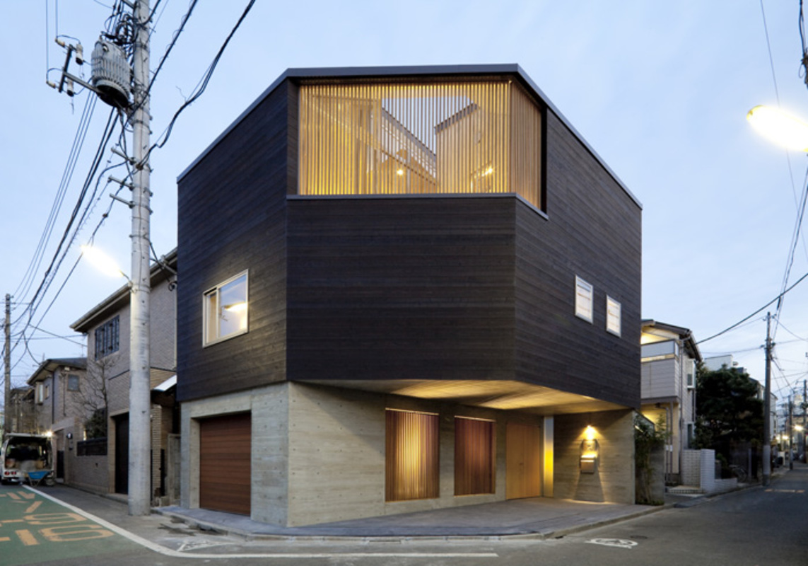 地価の高い都内の変形敷地の活用例です。敷地に沿わせた多角形の建物として敷地を目一杯利用。一台はビルトインガレージ、もう一台は張り出した建物下に置くことで狭い敷地であっても2台駐車を実現。RC造でありながら、木の好きな施主の好みを反映して、外断熱&木貼りの外観としています。木のルーバーからも光が漏れ、街角を照らす照明ともなっています。
