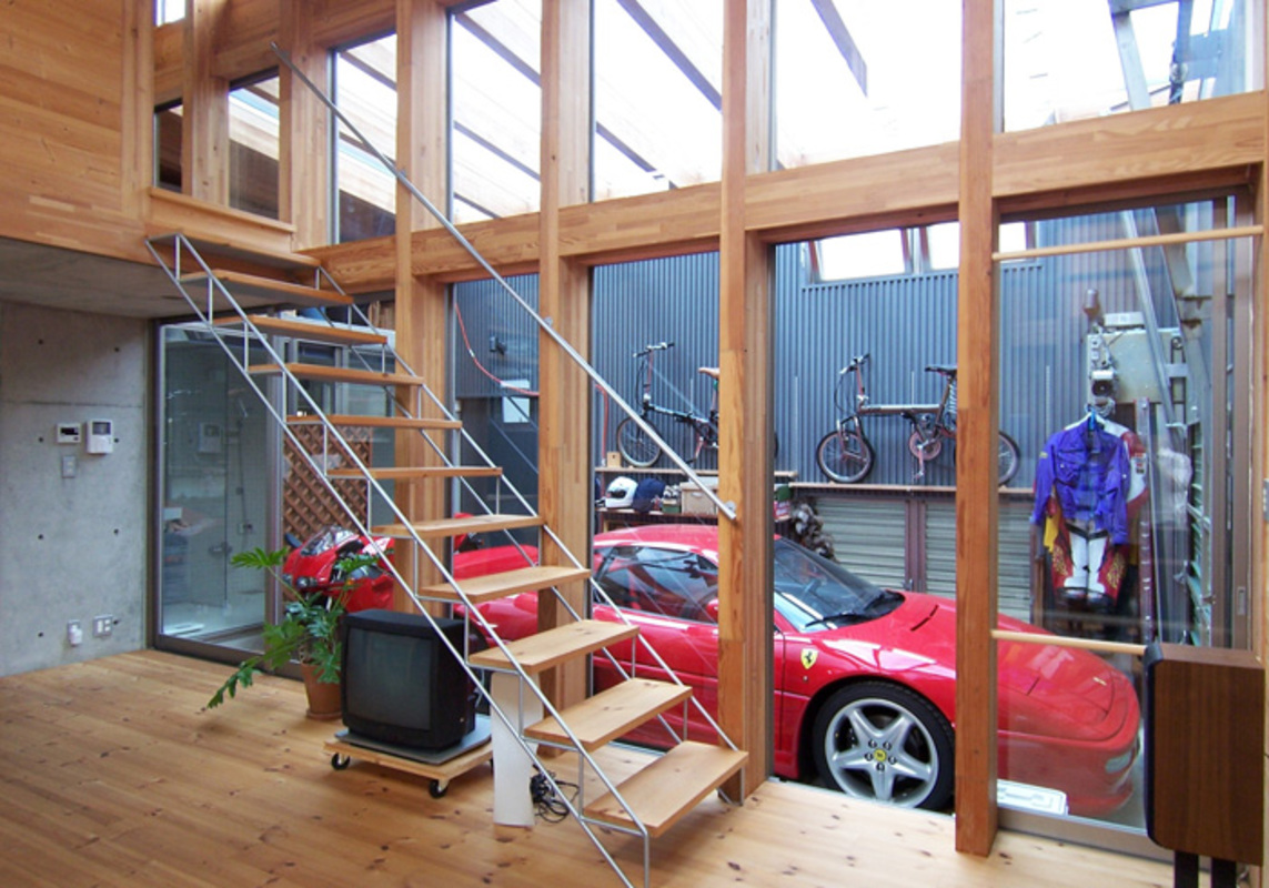 リビングからいつでも好きな車を眺めていたい。車好きの施主のためにデザインされた空間です。排ガスが出るため外部扱いですが、屋根もガラスとして、外のような中のような雰囲気の空間にしました。階段も出来るだけ透けたデザインとし、車の視覚を遮らないようにしています。