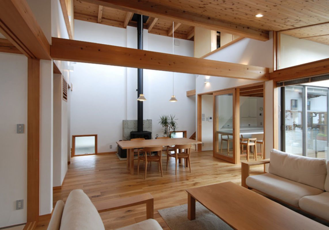断熱性、気密性を高めることは重要です。ただ、窓を小さくすれば数値的な性能は上がりますが、決して快適とは言えません。また、空調も照明もつけっぱなしの生活では、思ったように省エネにもならないケースも多いです。冬の日差しは貴重なエネルギー源。夏は庇で日差しを遮りつつ、冬の日差しはむしろ十分に取り込む方が効果的です。この事例では、ゼロエネルギーである薪ストーブを主暖房として使用し、さらに上部に溜まった暖気を床下に送って、快適な床下暖房を実現しています。中間ダクトファンをひとつ入れるだけですからコスト的にも最小限で済む方法です。