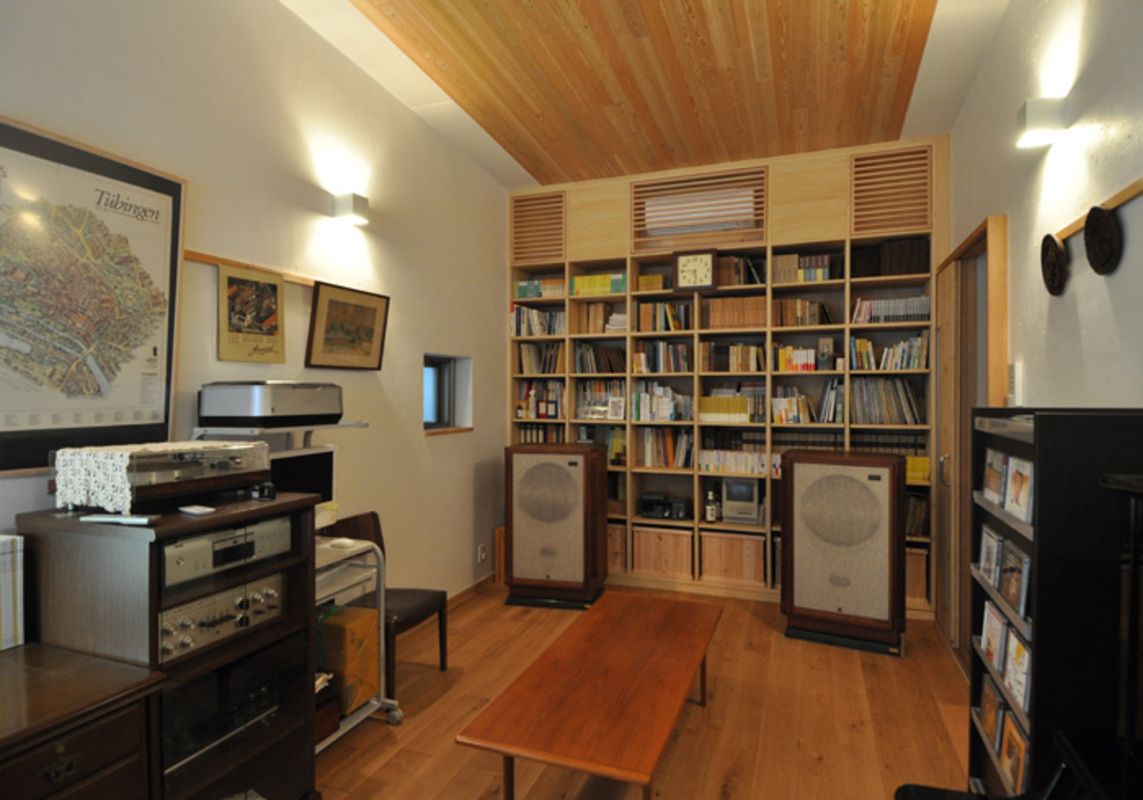RC造の建物の一角に設けたオーディオルームです。防音や音響性能に加え、普段使いの書斎としての快適性も両立した事例です。オーディオルームを専門業者に発注すると価格は高く閉鎖的な空間になりがちです。この事例は、本格的なオーディオルームを手作りで実現しました。躯体と縁を切ったコンクリートの二重床、吸音性もあり調湿性もあるしっくい壁、吸音パネルと木貼りを併用した天井、手作りの二重扉、既製サッシュ+手作りの木窓。吸音効果も担っている背面の本棚など、コストと性能を両立したオリジナルな工夫に満ちています。