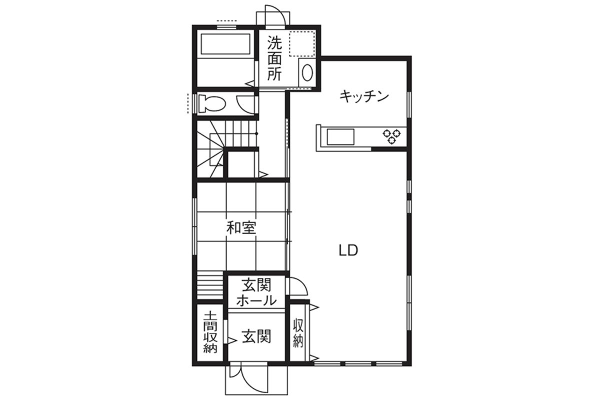 対面型キッチンのあるLDK。左手の奥が洗面、浴室となっていて家事動線の良いレイアウト。