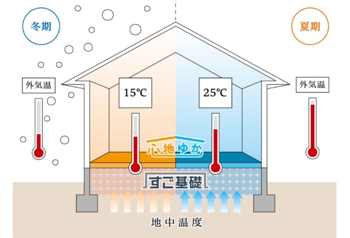 ユニバーサルホームの家は、地面の熱を活かす“地熱床システム”を採用。玄関も脱衣所もキッチンの下も、1階すべてが床暖房だから、家中どこにいてもあたたか。 床下全体からじんわりと家を包み込み、冬は暖かく、夏はひんやり快適に保ちます。風を起こさないので、肌やのどが乾燥しにくく、ホコリも舞いません。低温でやさしく温めるため、お子さまの低温やけどの心配もなく安心。さらに、蓄熱タイプの床暖房だからスイッチを切ってもぬくもりが長続き。タイマー制御で効率よく運転できる、省エネ仕様です。一度体感すると、その心地よさをきっと実感いただけます。