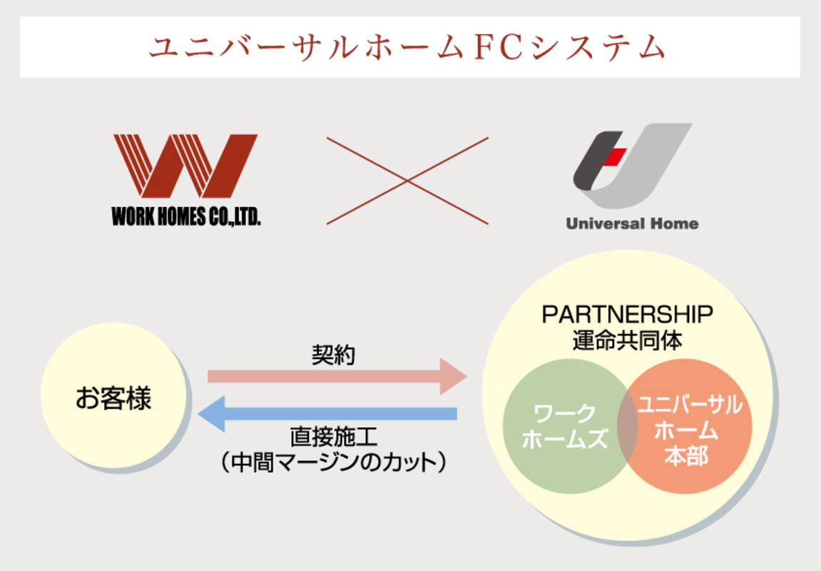 ワークホームズは、全国レベルで事業展開しているユニバーサルホームのフランチャイズシステムを採用しています。 このシステムは、大手住宅メーカーが長所として持つ「開発力」や「資源購入のスケールメリット」などと、地元工務店だからこそ出来る「きめ細かなサービス」や「迅速対応なアフターメンテナンス」などのお互いの長所を融合したシステムであり、その結果生まれたメリットを最大限に生かし、お客様に「省コスト・高品質住宅」をお届けしております。